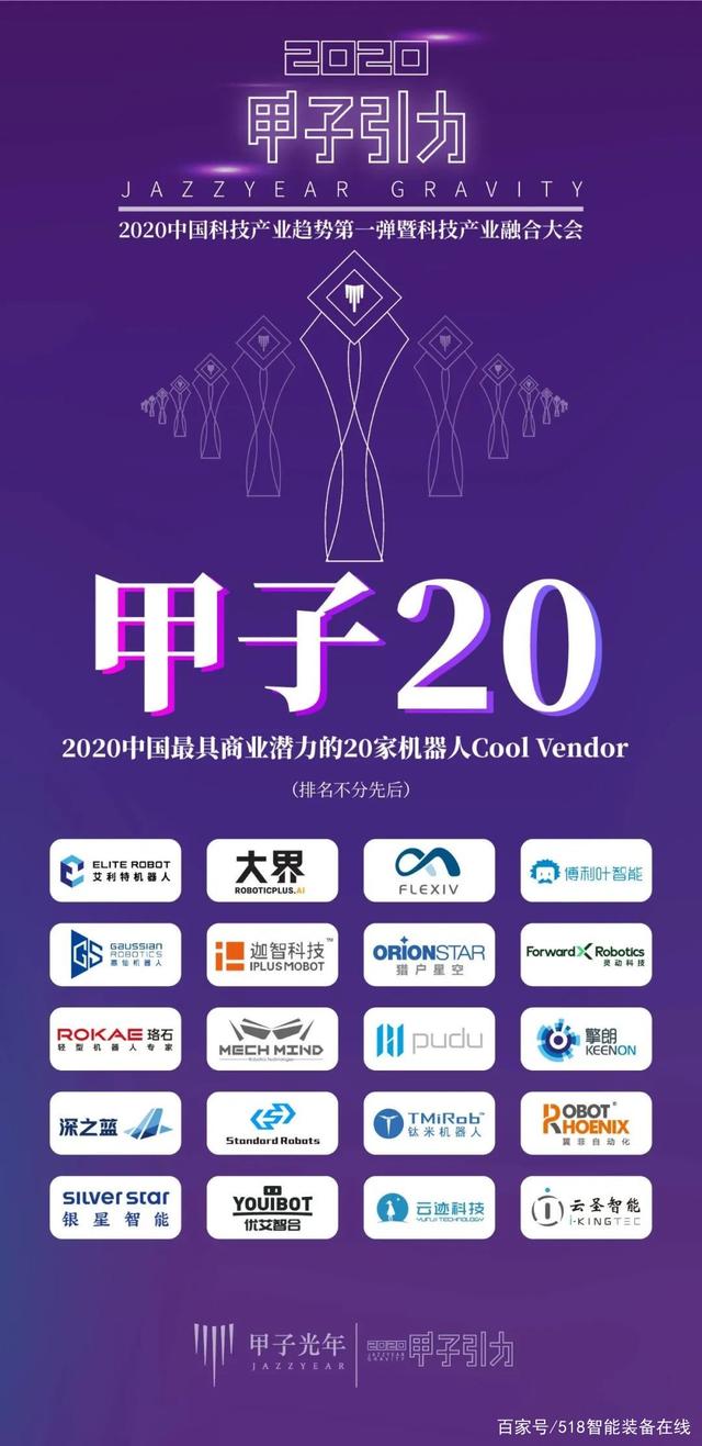 2020年11月14日,由工業(yè)和信息化部中國中小企業(yè)發(fā)展促進中心支持、北京甲子光年科技服務(wù)有限公司主辦的2020「甲子引力」大會于北京舉辦。艾得特機器人、大界、非夕科技、博利葉智能、擎朗、高仙機器人、迦智科技、靈動科技、優(yōu)艾智合、斯坦德、珞石、普渡、深方藍、鈦米機器人、翼菲自動化、銀星智能、運跡科技、云圣智能、梅卡曼德、獵戶星空、等20家入選2020“甲子20”暨2020中國最具商業(yè)潛力的20家機器人Cool Vendor。