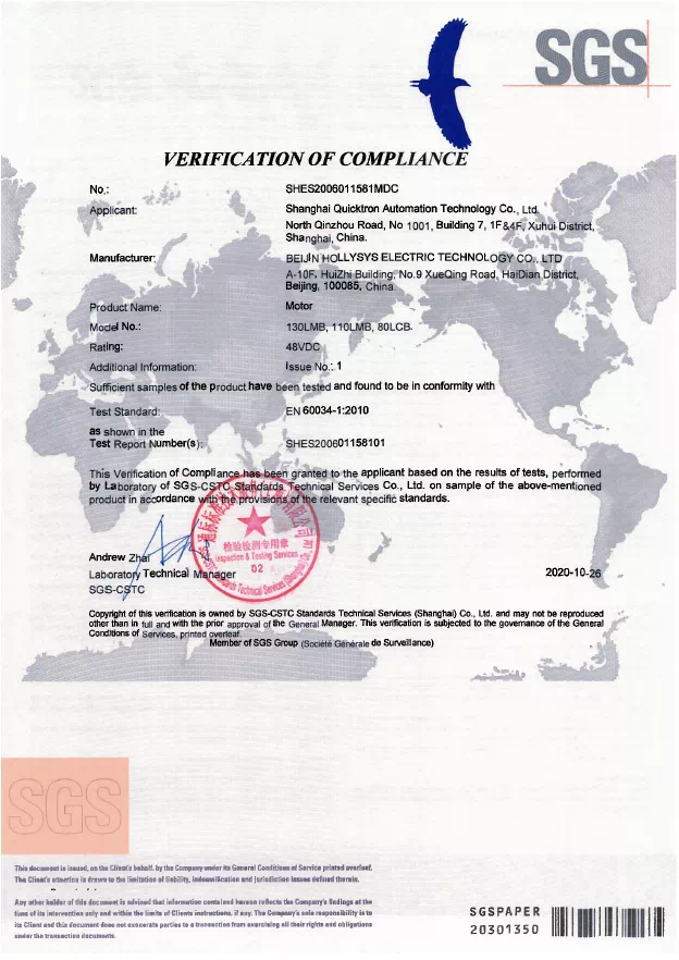 SGS是全球領(lǐng)先的檢驗(yàn)、鑒定、測(cè)試和認(rèn)證機(jī)構(gòu),是全球公認(rèn)的質(zhì)量和誠(chéng)信基準(zhǔn)。SGS作為國(guó)際權(quán)威認(rèn)證機(jī)構(gòu)為和利時(shí)電機(jī)產(chǎn)品頒發(fā)CE證書(shū)和RoHS證書(shū),是對(duì)和利時(shí)電機(jī)技術(shù)實(shí)力的專(zhuān)業(yè)背書(shū),增強(qiáng)了和利時(shí)電機(jī)產(chǎn)品在國(guó)際市場(chǎng)的品牌力,也助力設(shè)備制造商加速全球化步伐。