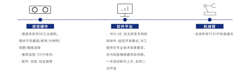 圖漾3D視覺引導軟包拆垛方案主要由圖漾核心自主專利的3D工業(yè)相機、深度學習算法及RVS-SE軟件、機械臂(可選)、工業(yè)PC等共同構成。