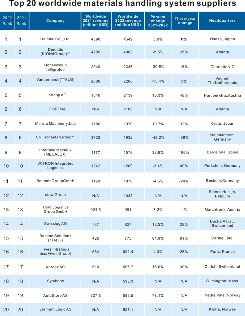 大福仍然以 45.4 億美元的年銷售額位居榜單第一,高于 2021年的  43.9 億美元收入。大福將其持續(xù)增長(zhǎng)歸功于上一年的大量訂單積壓、對(duì)半導(dǎo)體制造商的強(qiáng)勁銷售、零售和電子商務(wù)部門系統(tǒng)的擴(kuò)展以及服務(wù)收入的提高。
