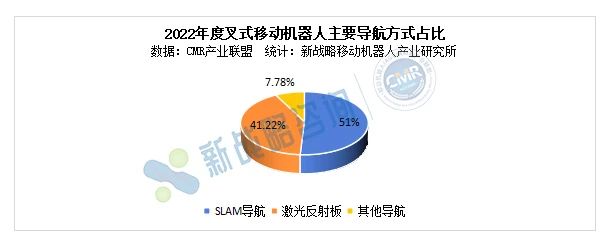 根據(jù)CMR產(chǎn)業(yè)聯(lián)盟數(shù)據(jù),新戰(zhàn)略移動(dòng)機(jī)器人產(chǎn)業(yè)研究所統(tǒng)計(jì),2022年,SLAM導(dǎo)航(激光+視覺(jué))的無(wú)人叉車占比首次超過(guò)了激光有反射板叉車,成為市場(chǎng)應(yīng)用主流,占比為51%,激光反射板無(wú)人叉車增速不如SLAM導(dǎo)航產(chǎn)品,占比下降,為41.22%。