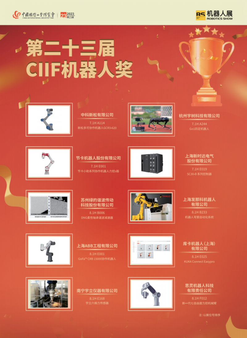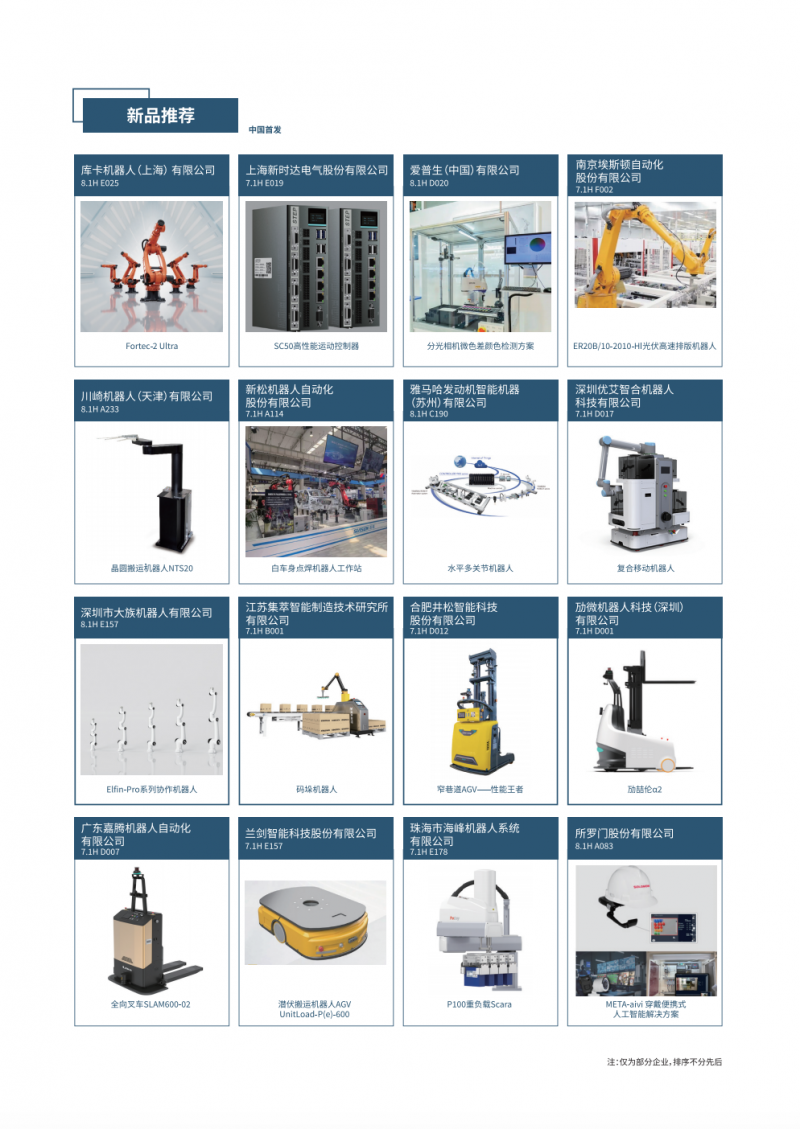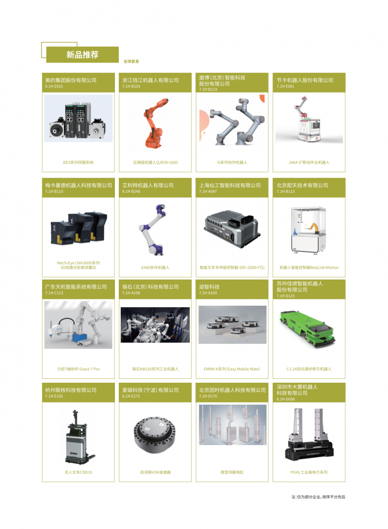 新品覆蓋了工業機器人本體、SCARA機器人、DELTA機器人、協作機器人、AGV/AMR、移動復合機器人、減速器控制器傳感器和伺服電機執行器等核心零部件、軟件及系統集成應用等,彰顯最前沿的機器人技術,為新型工業化注入新動能。