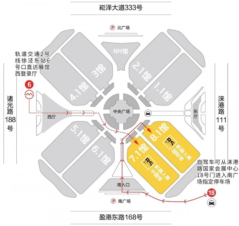 1.如果您乘坐軌道交通2號線徐涇東站4/5/6號口直達展館西登錄廳,沿著中央廣場往東即可到達7.1H&8.1H;
