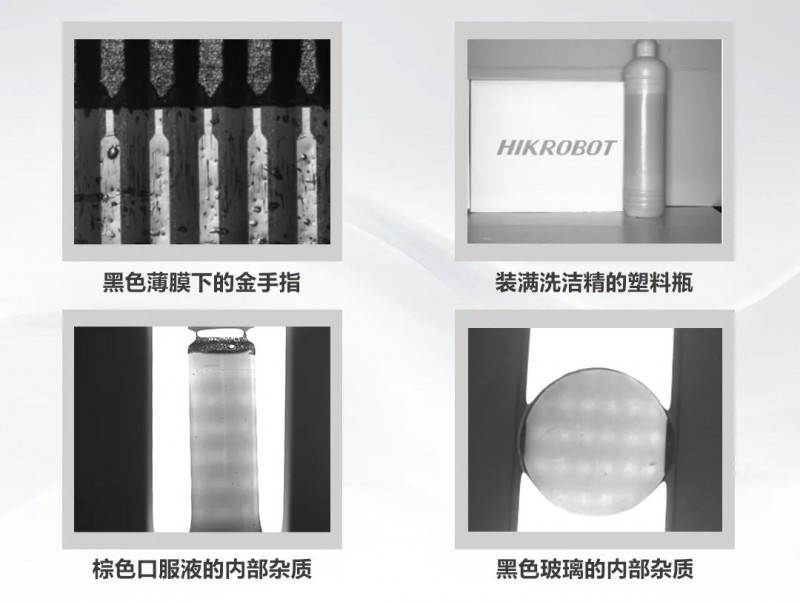 SWIR可以透過多種材料。如不同材質(zhì)的物品,在特定的紅外波段下,會根據(jù)吸收、反射程度而呈現(xiàn)透明、半透明、白色、黑色等不同狀態(tài),適用于同色材料分選,塑料內(nèi)部填充物檢測、深色物品內(nèi)部劃痕等。