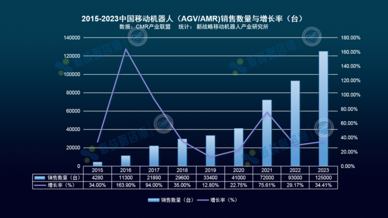 報告內容:全篇8大章節120頁超180張圖表,從不同角度分析當前中國移動機器人市場。包括銷售規模及數量、熱門細分應用領域、熱門細分產品類別、產業鏈各部分剖析、中國市場代表企業、未來發展趨勢等。根據CMR產業聯盟數據,新戰略移動機器人產業研究所統計,從2015年至2023年,中國市場移動機器人(AGV/AMR)產業年復合增長率達43.18% ;2023年中國移動機器人(AGV/AMR)銷售規模約為212億,同比增長14.59%;銷售數量約為125000臺,同比增長34.41%。