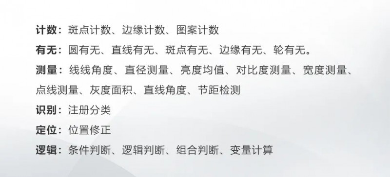 SC1000系列視覺傳感器集成計(jì)數(shù)、有無、正反、尺寸測量、AI注冊分類等20余種檢測算法,覆蓋各類常見傳感應(yīng)用場景,同時(shí)可對激光、光電、位置等傳感器的一些應(yīng)用的局限性進(jìn)行有效的補(bǔ)充。