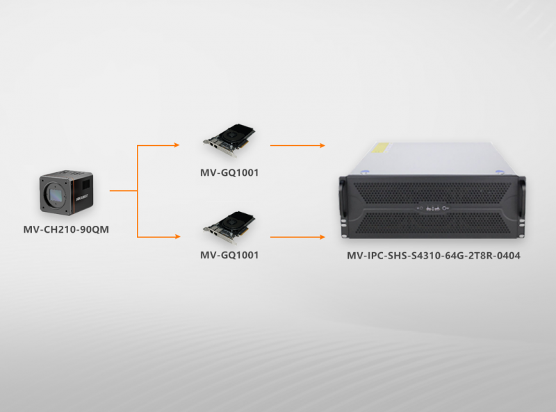 方案采用CH系列2100W分辨率/540幀面陣相機(jī),通過2張50G單口光口卡GQ1001,將所有原圖數(shù)據(jù)同步傳輸至14GB/s連續(xù)寫入性能,16TB容量的SHS系列高速讀寫服務(wù)器中。