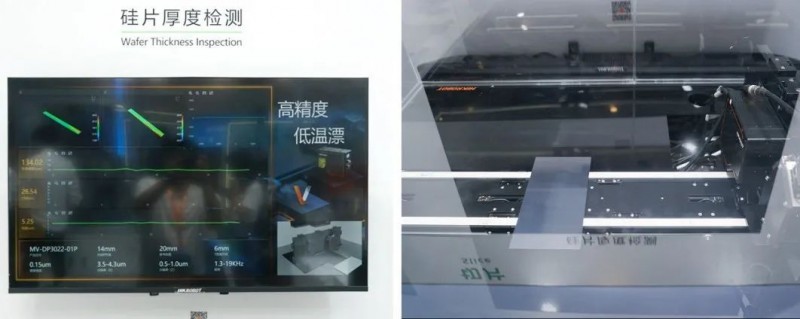 該環(huán)節(jié)還展示了硅片厚度/側(cè)邊檢測方案。其中,六臺3D激光輪廓傳感器測試硅片厚度,六臺相機兩兩對射,同時測量三組數(shù)據(jù)結(jié)果。硅片平均厚度數(shù)據(jù)重復(fù)性精度≤0.5μm,TTV(單線厚度波動)重復(fù)性精度≤1.5μm,線痕(單線輪廓高度)重復(fù)性精度≤2μm。