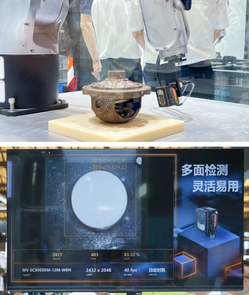 集成像、算法、存儲(chǔ)、通信于一身的SC3000X系列視覺傳感器,體積小巧,外觀緊湊,安裝更加靈活,內(nèi)部嵌入了讀碼、有無、正反、測(cè)量、識(shí)別和計(jì)數(shù)等防錯(cuò)檢測(cè)算法,搭配機(jī)械臂對(duì)鑄造件的各個(gè)面進(jìn)行碼信息、字符信息的檢測(cè)。