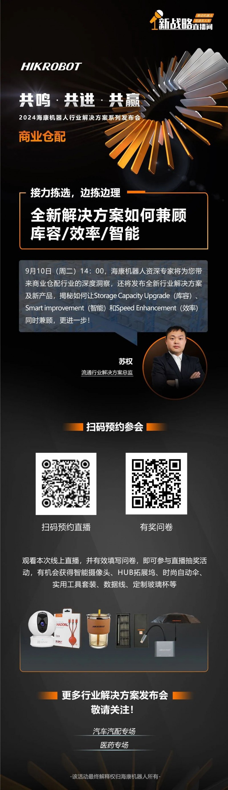 9月10日(周二)14:00,海康機(jī)器人資深專家將帶來商業(yè)倉配行業(yè)的深度洞察與技術(shù)分享,同時發(fā)布全新行業(yè)解決方案和新產(chǎn)品,揭秘新方案如何做到任務(wù)解耦,接力揀選,同時突破揀、理貨無法并行的挑戰(zhàn),做到邊揀邊理,讓