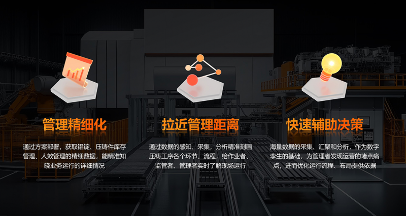 該方案把一體化壓鑄按照物料形態(tài)和工序分成三個(gè)場(chǎng)景,鋁錠收貨存儲(chǔ)及上線;壓鑄、機(jī)加、裝配工位間半成品上下料及轉(zhuǎn)運(yùn);壓鑄半成品、成品倉(cāng)儲(chǔ)三個(gè)場(chǎng)景,實(shí)現(xiàn)運(yùn)營(yíng)精細(xì)化管理、拉進(jìn)管理者距離、為優(yōu)化作業(yè)流程提供輔助決策依據(jù)。