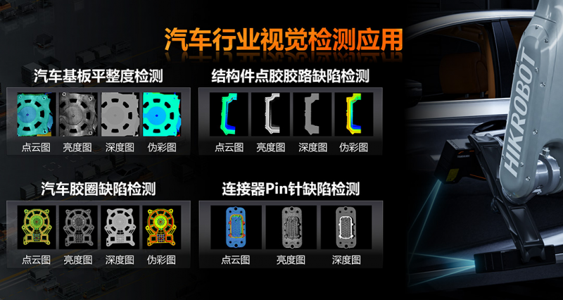 在汽車行業(yè)中,質(zhì)量缺陷檢測(cè)至關(guān)重要。海康機(jī)器人擁有成熟的產(chǎn)品和解決方案,可應(yīng)用于多個(gè)環(huán)節(jié),包括汽車基板平整度檢測(cè)、深度圖與點(diǎn)云圖的拼接,以及結(jié)構(gòu)件點(diǎn)膠膠路缺陷檢測(cè)和連接器Pin針缺陷檢測(cè)等。