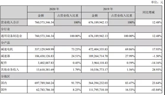 從年報(bào)來(lái)看,中大力德2020年國(guó)內(nèi)業(yè)務(wù)收入6.98億元,同比增長(zhǎng)23.64%;國(guó)外業(yè)務(wù)收入0.63億元,同比下滑43.84%。境外業(yè)務(wù)下滑明顯,主要原因是疫情原因高毛利率的海外訂單收到影響,公司海外業(yè)務(wù)占比從19年的16.53%下降到20年的8.25%。