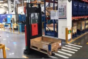 針對某大型制造企業(yè)生產車間現場環(huán)境變化大,空間狹窄,且?guī)煳慌c產線工位較多,同時運行多臺無人叉車容易發(fā)生碰撞、死鎖等痛難點,坤厚在PS10的基礎上為其打造了高效的智能搬運方案。為了適應該企業(yè)狹小車道及對控制精度的需求,坤厚采用了七臺PS10窄通道托盤堆高車,整車尺寸更小。通過激光傳感器掃描周圍環(huán)境,在系統(tǒng)中創(chuàng)建地圖,并在行駛過程中應用激光傳感器不停地獲取環(huán)境的信息,與地圖數據進行匹配定位,同時配合運動控制器,控制算法,使得該款無人叉車實現了在狹窄的通道內靈活轉彎、自由穿梭,直角堆垛寬度更是降低為兩米,能耗也降低了近30%。滿足了該企業(yè)密集倉儲的需求。重復定位精度可達±5mm以內。