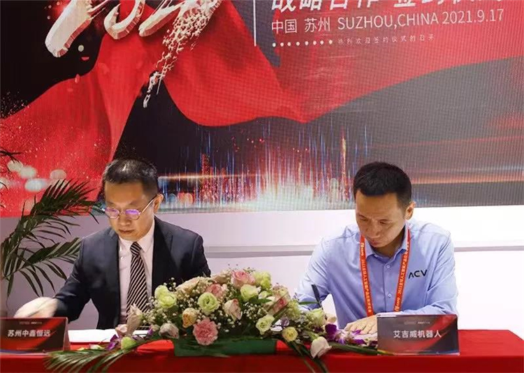 9月17日,蘇州艾吉威機器人有限公司(以下簡稱“艾吉威”)在2021全球人工智能產(chǎn)品應(yīng)用博覽會現(xiàn)場完成新一輪融資簽約。在蘇州政府領(lǐng)導(dǎo)、企業(yè)合作伙伴、各行業(yè)精英代表及知名媒體的共同見證下,本輪投資方華鑫證券與中鑫資本代表孔勇軍先生、官子安先生,艾吉威機器人創(chuàng)始人劉勝明先生、聯(lián)合創(chuàng)始人司秀芬博士出席簽約儀式并鑒約。