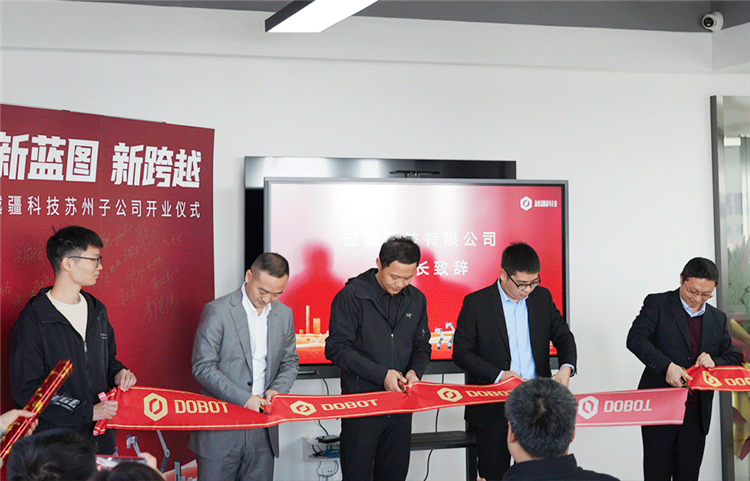 開(kāi)業(yè)典禮上,深圳市越疆科技有限公司董事長(zhǎng)兼CEO劉培超、越疆智能機(jī)器人(蘇州)有限公司總經(jīng)理劉主福、深圳市越疆科技有限公司工業(yè)事業(yè)部副總經(jīng)理劉曉明、深圳市越疆科技有限公司工業(yè)事業(yè)部商務(wù)運(yùn)營(yíng)總監(jiān)李劉偉共同為越疆科技蘇州子公司揭牌剪彩。