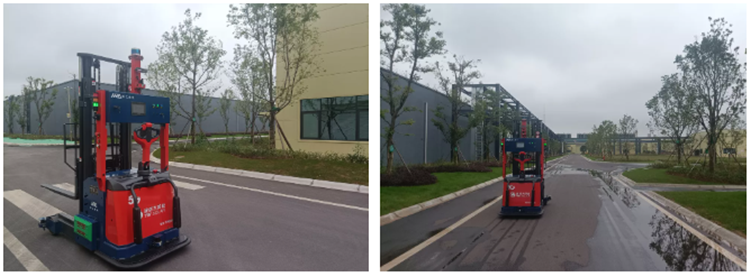 哈工庫訊為通威太陽能打造的室外融合導航無人叉車項目,無人叉車室外激光導引使用GPS/北斗融合+3D雷達+視覺導引方式,提供穩定可靠的提供高精度位姿,對環境要求低,室內外通用,使用簡單方便,降低人工維護難度,無需布置靶標,解決靶標布局布置困難等。無人叉車能夠適應各種天氣氣象?;旌蠈Ш剿惴ㄌ峁┛煽康母呔鹊亩ㄎ恍畔?,融合GPS/北斗定位、自然導航和靶標導航,定位精度高、操作簡單、環境適應性高。該算法對激光雷達點云提供異常處理,可有效的對抗室外雨、雪、霧、大風等惡劣天氣,不受光照影響,支持室內外穿行,穩定提供可靠定位信息,可保證重復定位精度在±5mm以內;該算法支持上下坡、平地建圖導航功能;算法內部自適應支持多種工作場景,配置簡單方便,非專業人員也可以完成配置并使用;該算法支持多次建圖、在線建圖、離線建圖等功能。