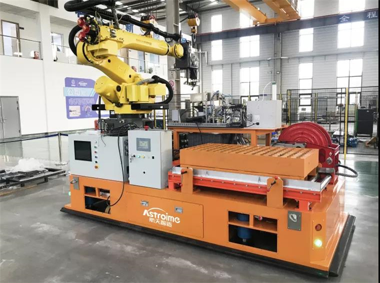 航天智造打造復合型重載AGV適用于風電行業(yè)葉片根部雙頭螺栓的安裝與檢測,實現(xiàn)了葉片自動識別型號、自動夾取螺栓、自動進行O型橡膠密封圈安裝和涂抹螺紋膠、擰緊作業(yè)、設備扭矩數(shù)據(jù)互通等智能化。