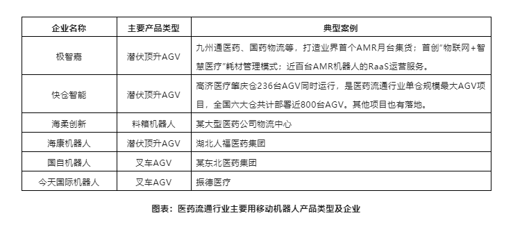 圖表:醫(yī)藥流通行業(yè)主要用移動(dòng)機(jī)器人產(chǎn)品類型及企業(yè)
