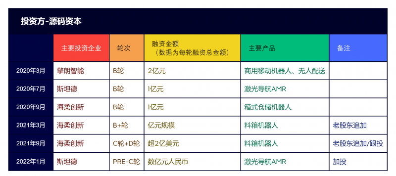 2020年至2021年,在移動機器人行業(yè),源碼資本參與了7起融資案件,每輪融資總金額均為億元級規(guī)模。